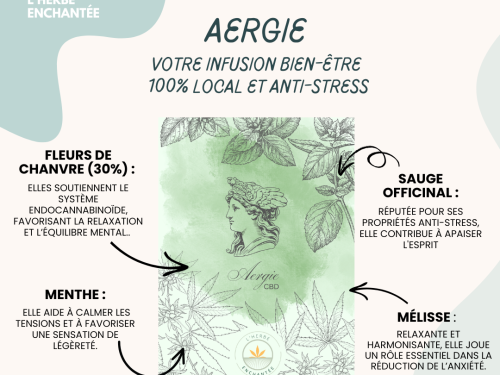 Aergie, la personnification de la paresse et de la relaxation, inspire cette tisane dédiée à la détente, à la réduction du stress et de l'anxiété. Ce mélange est parfait pour ceux qui cherchent à ralentir et à profiter d’un moment de calme dans une journée agitée. Aergie vous invite à prendre une pause, à vous ressourcer et à relâcher les tensions accumulées. Tout est cultivé sur notre ferme sans engrais chimiques ni pesticides ! Les ingrédients d'Aergie sont soigneusement choisis pour aider à réduire le stress et apporter un apaisement naturel : Fleurs de chanvre (30%) : riches en cannabinoïdes, elles soutiennent le système endocannabinoïde, favorisant la relaxation et l’équilibre mental. Menthe : rafraîchissante et apaisante, elle aide à calmer les tensions et à favoriser une sensation de légèreté. Sauge : réputée pour ses propriétés anti-stress, elle contribue à apaiser l'esprit. Mélisse : relaxante et harmonisante, elle joue un rôle essentiel dans la réduction de l’anxiété. Poids net: 30g (environ 25 à 30 infusion de 250 ml)